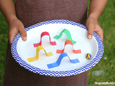 Turn a paper plate into a maze using construction paper and glue. Tilt and twist to guide the marble through—great for focus and fun. Find out more at Buggy and Buddy.