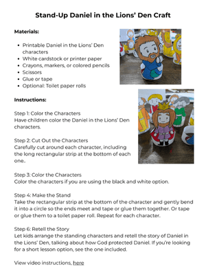 The Daniel in the Lions’ Den stand-up characters are available as a printable download. Simply download the file, print the pages on regular printer paper or cardstock, and you’re ready to begin. Printing on cardstock will make the characters sturdier, especially if they will be used multiple times for storytelling and play.