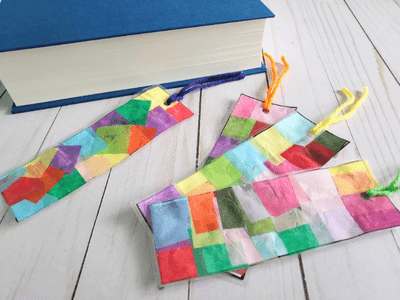 Create unique bookmarks by gluing colorful tissue paper onto cardstock, then laminating or covering them with clear tape. A fun and functional craft for little readers. From Darcy and Brian.