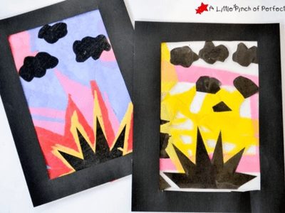 Kids layer warm-toned tissue paper to create a glowing sunset scene on wax or contact paper. The overlapping colors look especially beautiful when held up to a window. From a Little Pinch of Perfect.