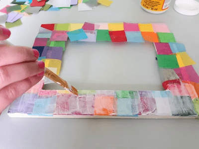 Decorate a craft photo frame with torn tissue paper for a bright, personal touch. Add a favorite photo and it becomes a sweet keepsake. Also from Darcy and Brian.